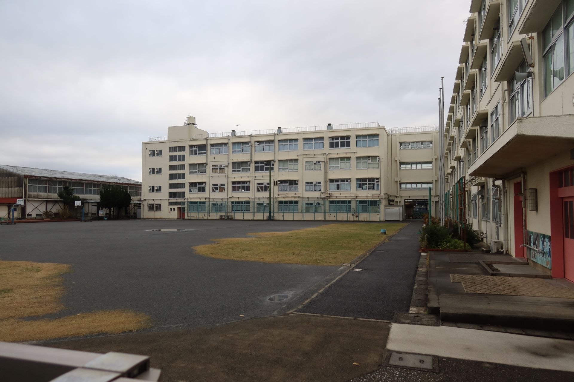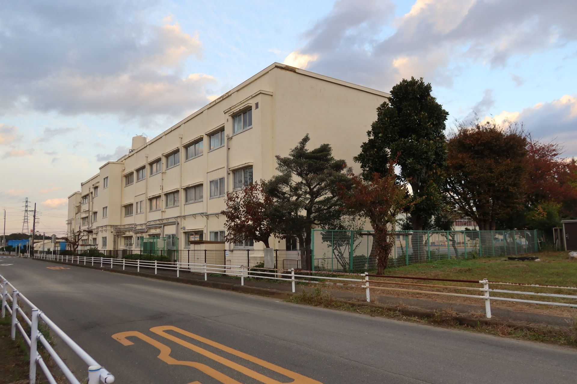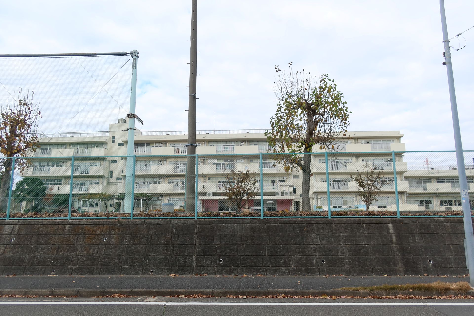 学校の周囲は半分が農園、残り半分が住宅地といったところで、斜面の途中に立地しているためか、外周道路は坂道が多かったです。そして、校庭では少年野球が行われており、「オーイオーイ」の掛け声や、ボールを打つ音なんかが聞こえていました。