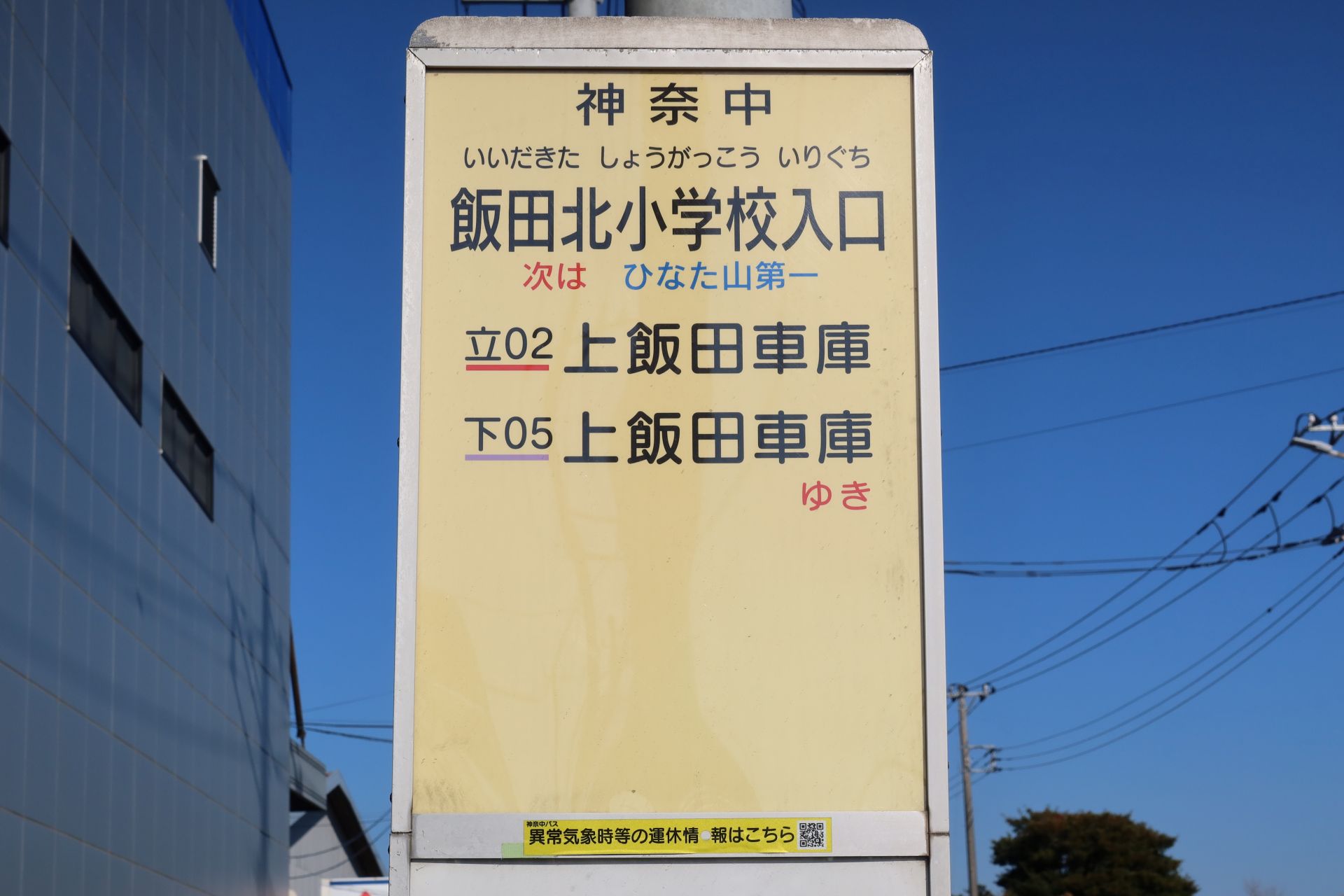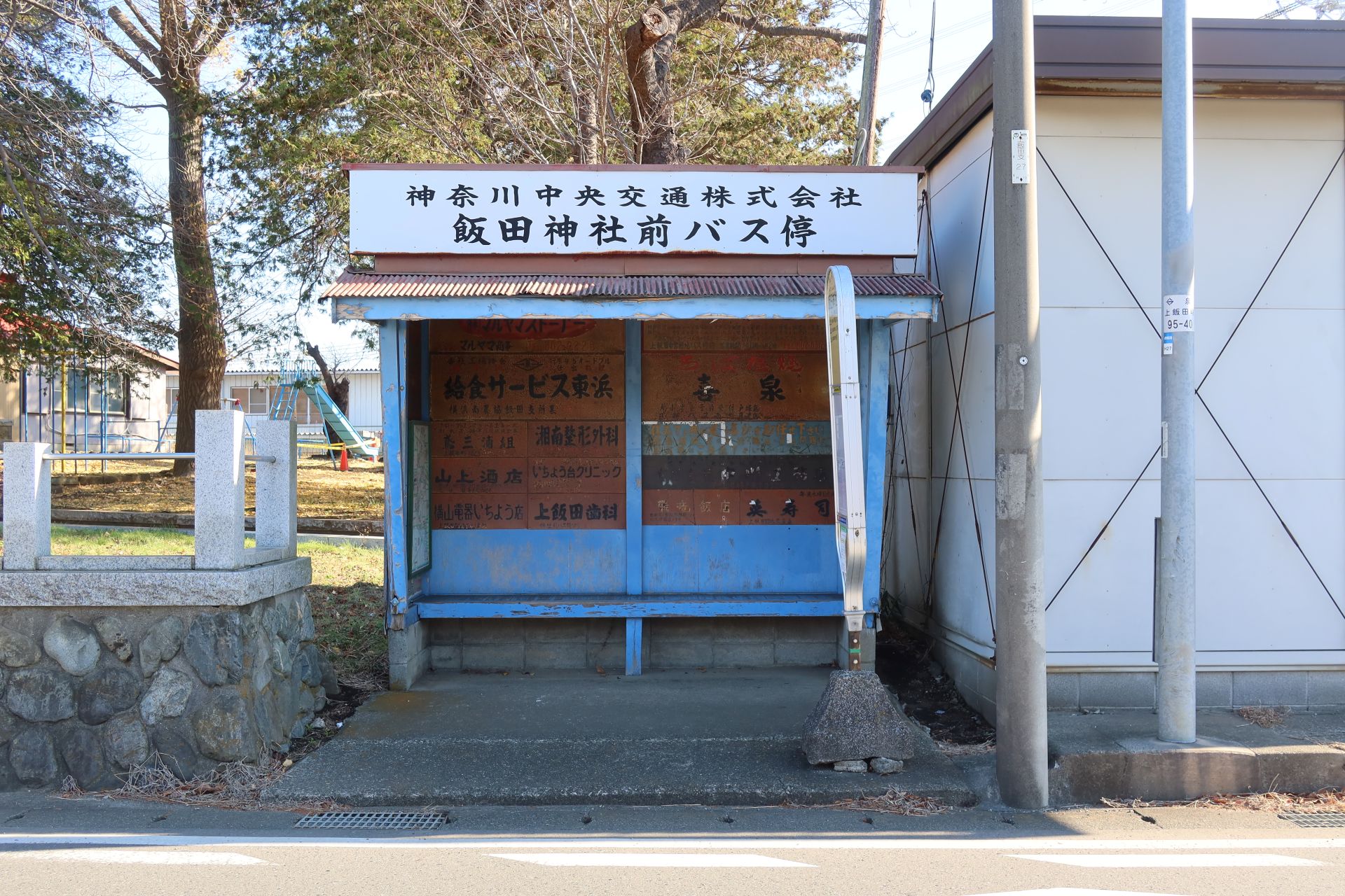 隣の飯田北小学校から歩いてきましたが、校舎は正方形に近い建物が廊下で結ばれている構造になっていたのが印象的でした。学校からは歩いて境川方面に向かったのですが、途中にある「飯田神社前」のバス停がレトロで、なんだか「となりのトトロ」に出てきそうじゃありませんか?と言いたくなるような雰囲気。待合室内の看板を見ると「戸塚区上飯田町」と書かれていたことから、少なくとも泉区ができた1986年より前で、一方「上飯田団地」の表記もあったので団地竣工の1966年以降のものだと思います。