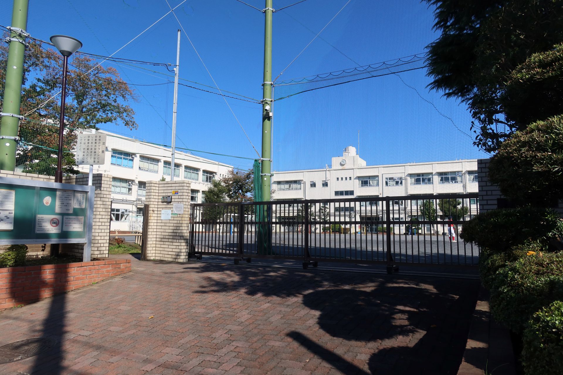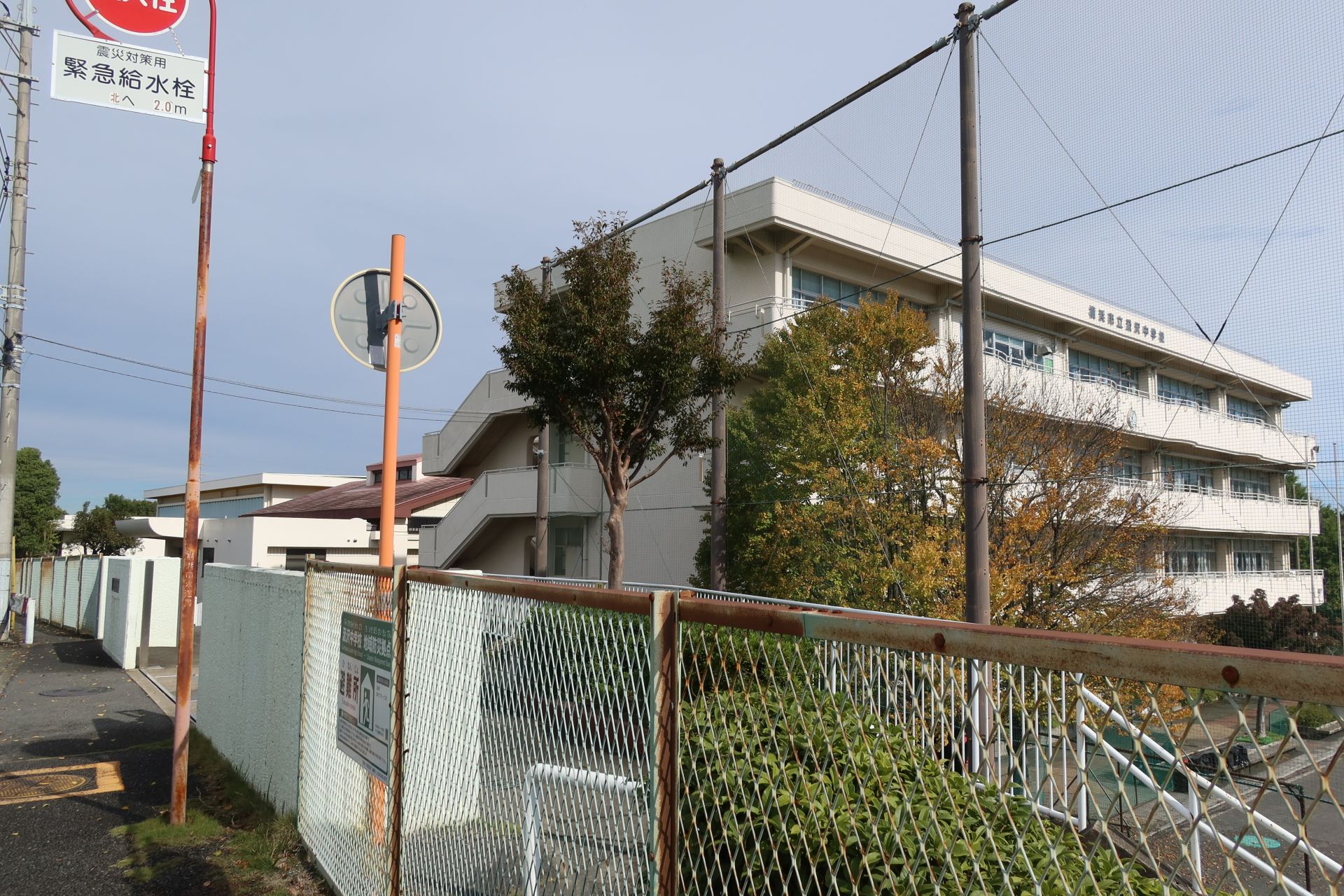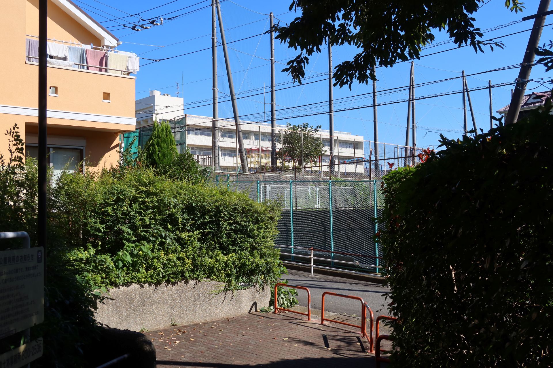 学校の周囲は半分が農園、残り半分が住宅地といったところで、斜面の途中に立地しているためか、外周道路は坂道が多かったです。そして、校庭では少年野球が行われており、「オーイオーイ」の掛け声や、ボールを打つ音なんかが聞こえていました。