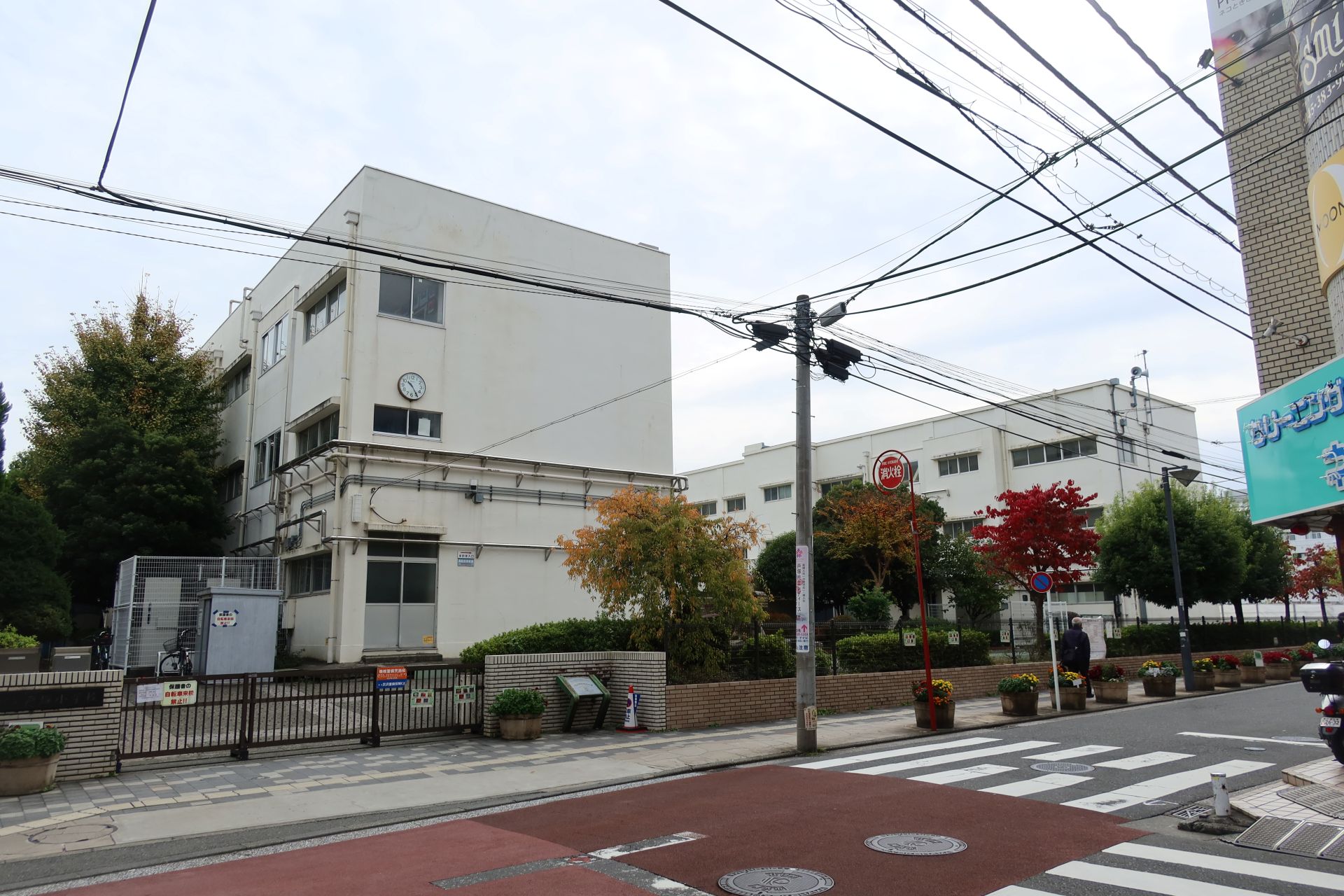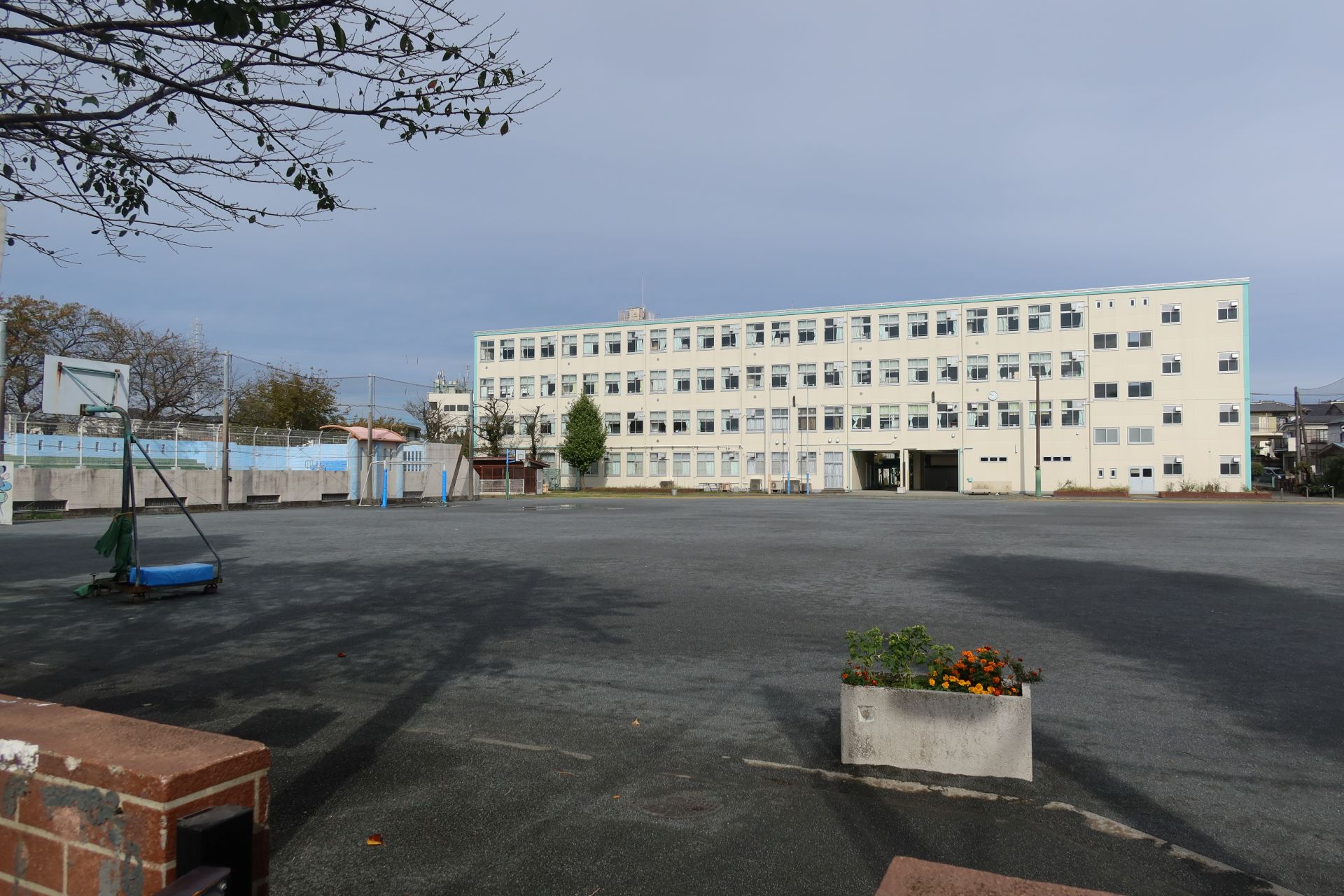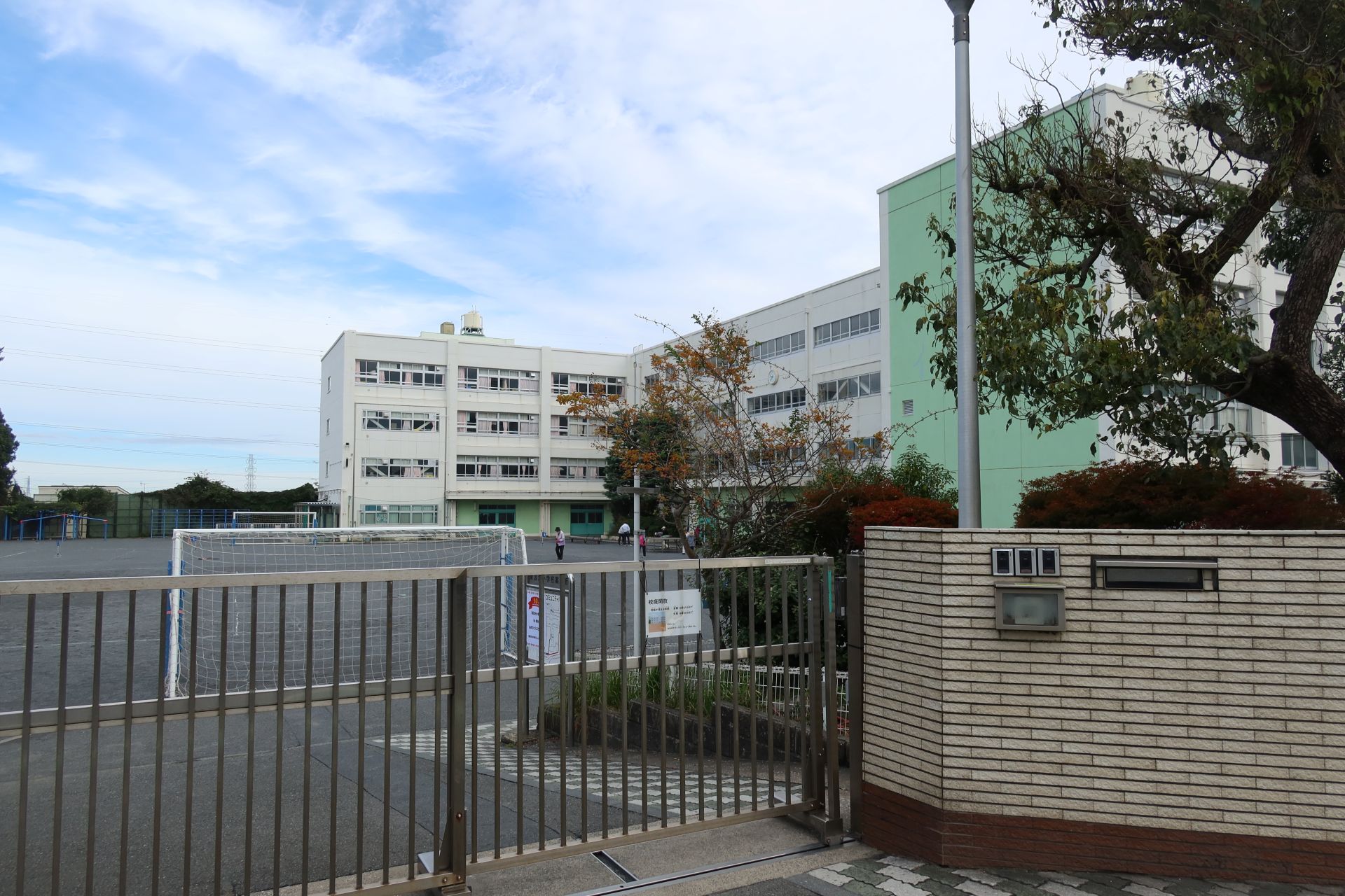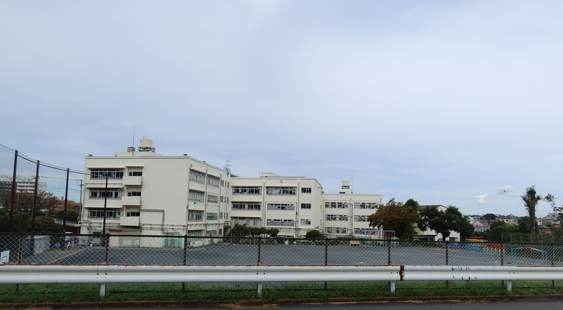 学校の周囲は半分が農園、残り半分が住宅地といったところで、斜面の途中に立地しているためか、外周道路は坂道が多かったです。そして、校庭では少年野球が行われており、「オーイオーイ」の掛け声や、ボールを打つ音なんかが聞こえていました。