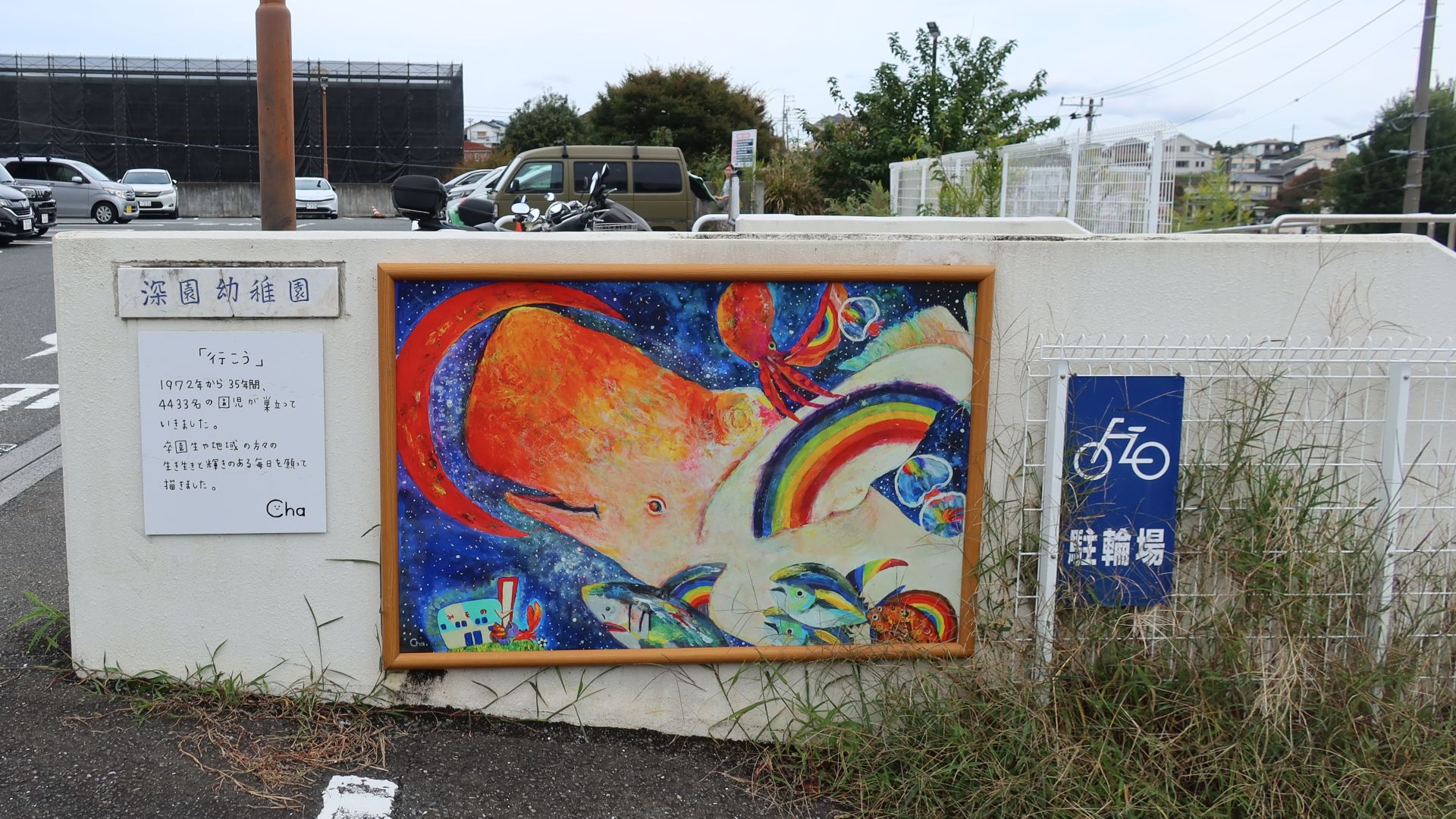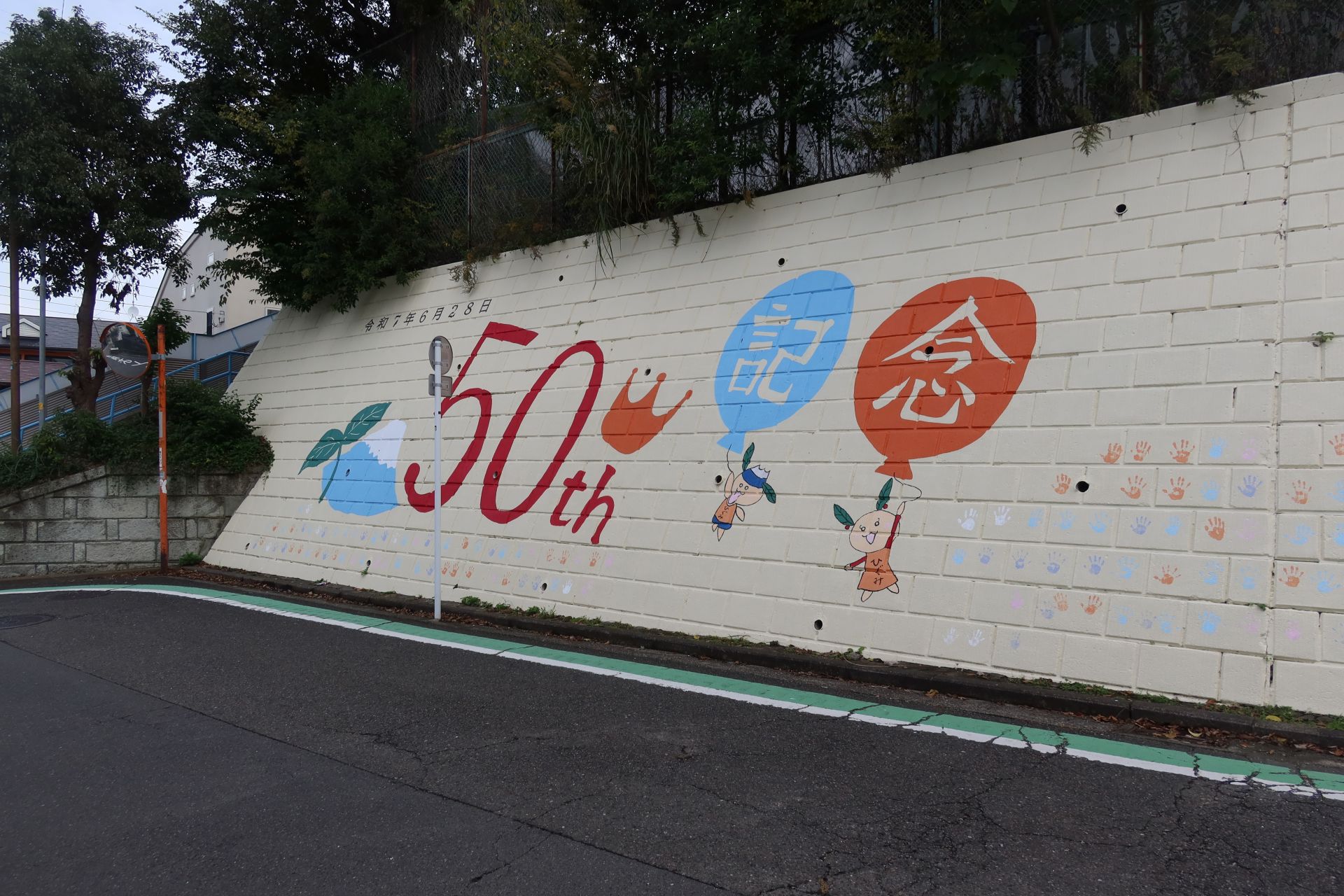 汲沢団地の通りから急な坂を上った先にある学校です。擁壁には、創立50周年を記念した壁画が描かれていました(「ひぐみ」という名前のマスコットキャラクターと子供たちの手形です)。