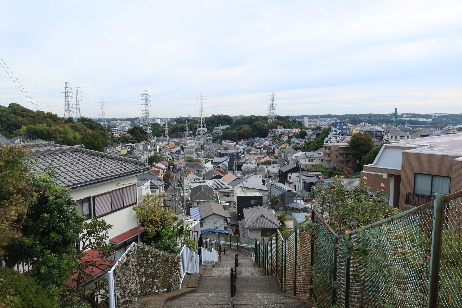 さらに進むと、そこは高台の縁になっていて、階段の上から眺めると、谷筋の向こうに戸塚方面のワンマン道路や、モディ―の上部などを見ることができました。