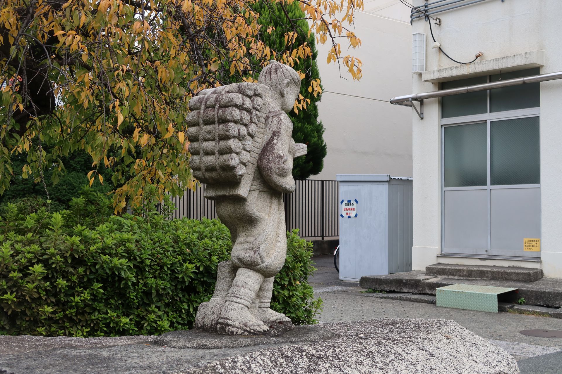 学校前の道路から校内を見ると、ちょうどそこに二宮金次郎の石像がありましたが、これは新校舎に移築されるのでしょうか。学校の東側に回り込むと、そこは柏尾川の遊歩道になっていて、カルガモが何羽かきていました。