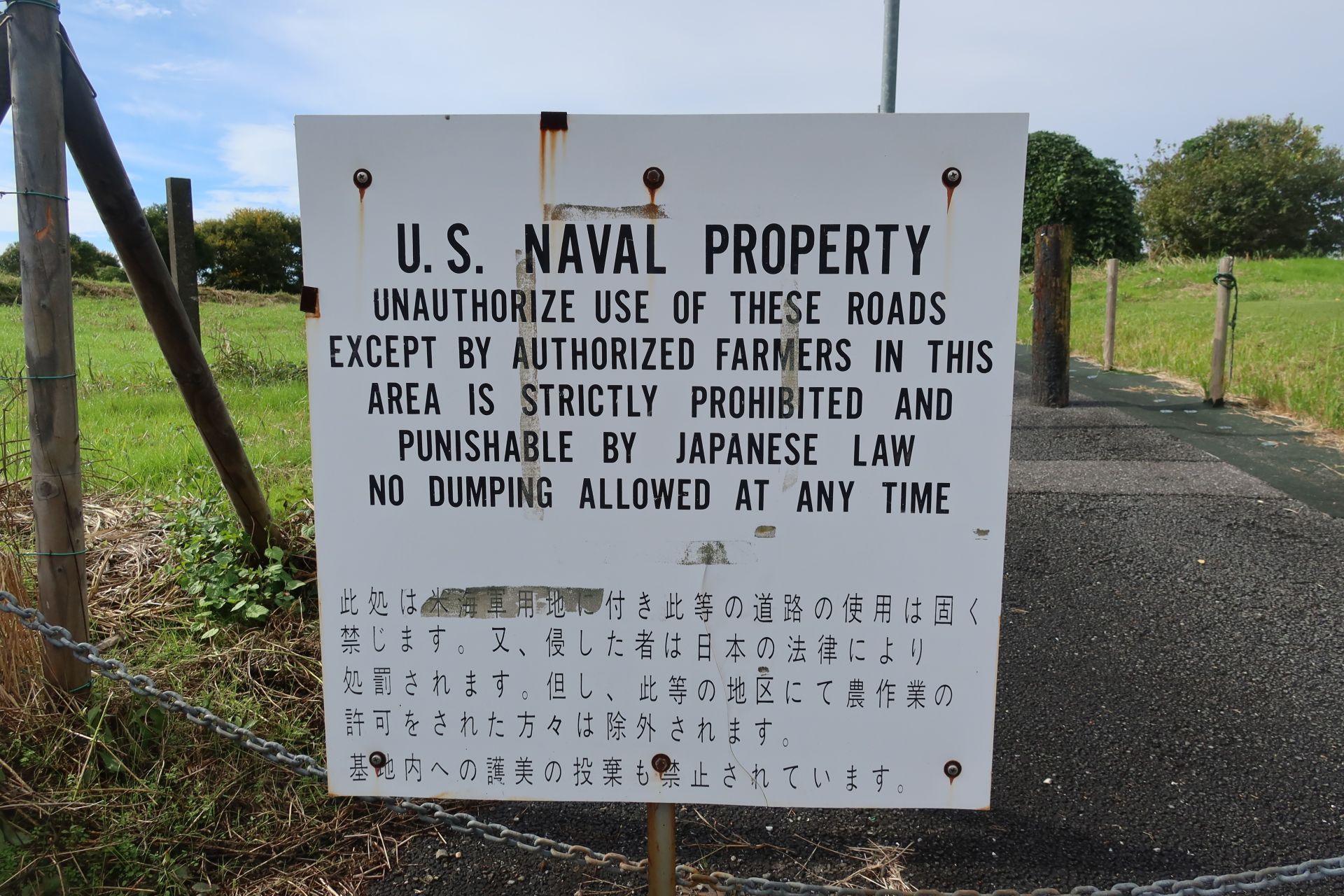 学校の前は旧米軍深谷通信隊跡の草原になっていて、遠くに大山や少し雪をかぶった富士山の姿を見ることができました。通信隊が日本に返還されたのはもうだいぶ前になると思うのですが、敷地の周囲には、当時のものと思われる英語の看板(日本語訳つき)が今でも残されていました。
