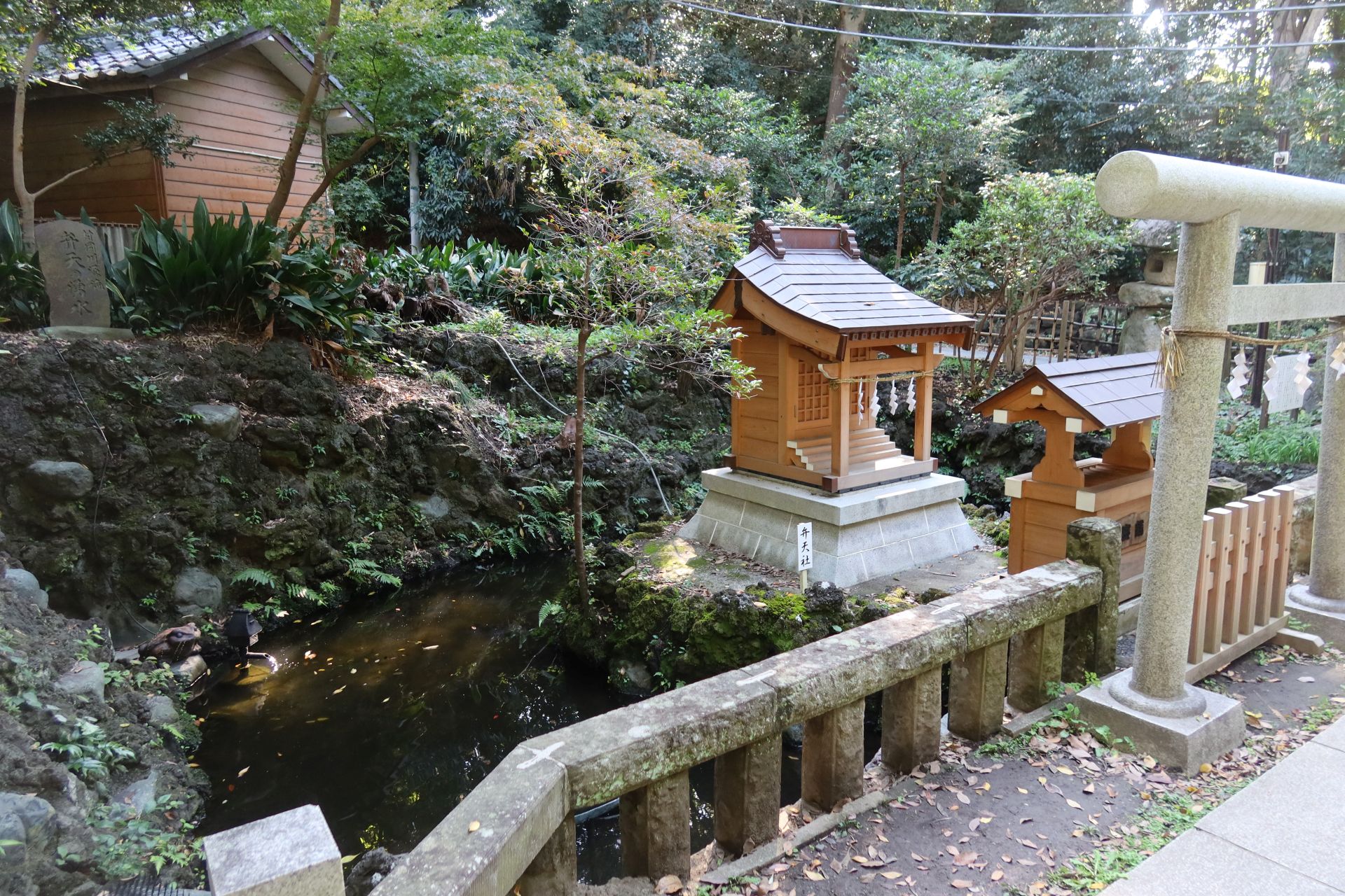 なお、学校から少し離れた所まで歩いていくと、そこには御霊神社という少し大きめの神社があって、その境内にある弁天池が村岡川(宇田川)の源流になっています。池のほとりには「村岡川源流」の石碑も建っていました。