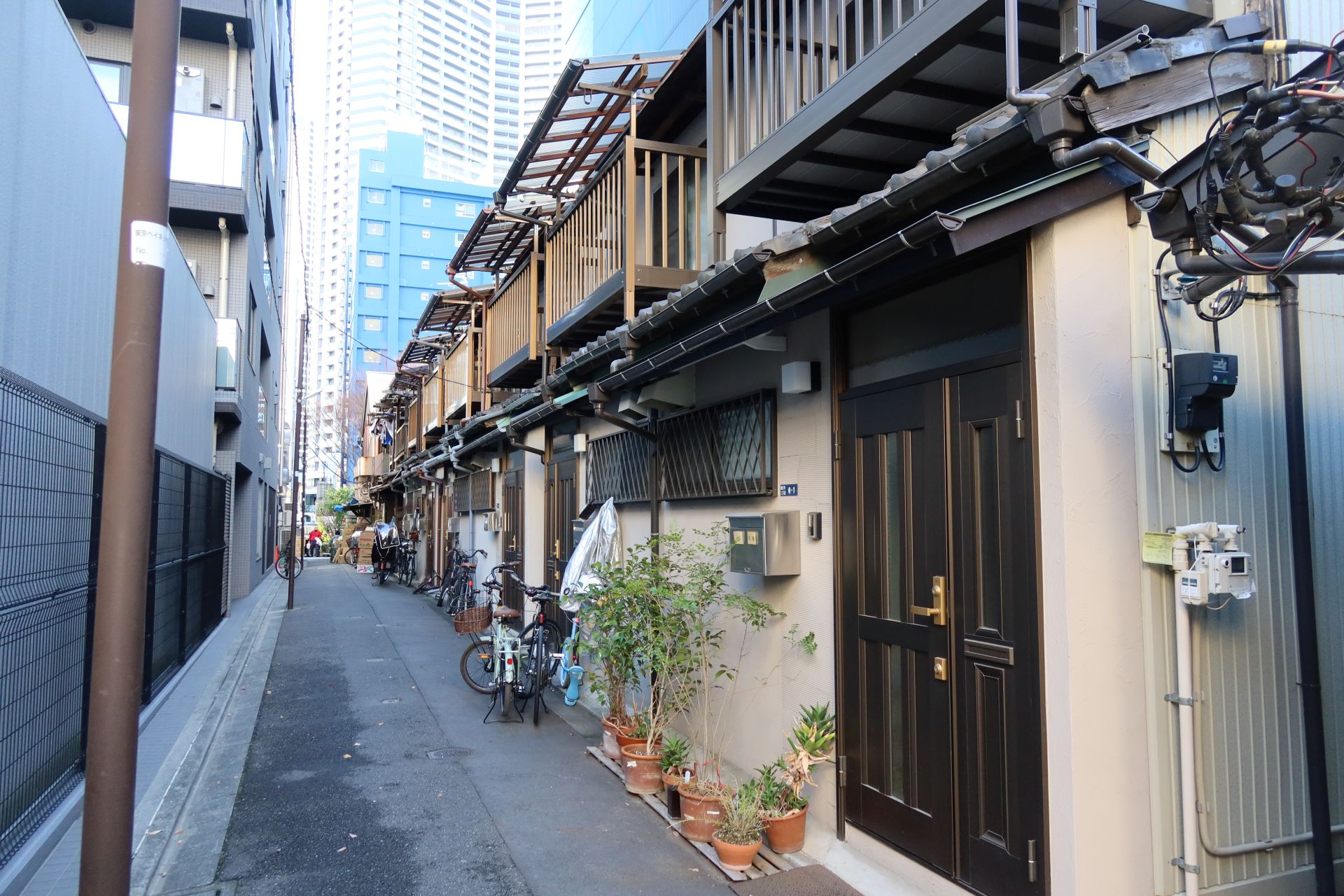 先週墨田区京島周辺を散策していた時、東京下町にも戦災を免れた地域があることを知り、今回その流れで月島を散策してみること。大江戸線の月島駅を降りるともんじゃ焼きのストリートがどどーんとあって、観光客でにぎわっていましたが、norimakiが見たかったのはそこから伸びている細い路地。その中に木造2階建て、2軒続きの長屋がいくつかありました。詳しい年代は分からないけれど、戦前からあるものじゃないのかなと思います。ただ、この日も解体工事中のところがあって、このレトロな風景が見られるのもそう長くは無いのかも知れません。