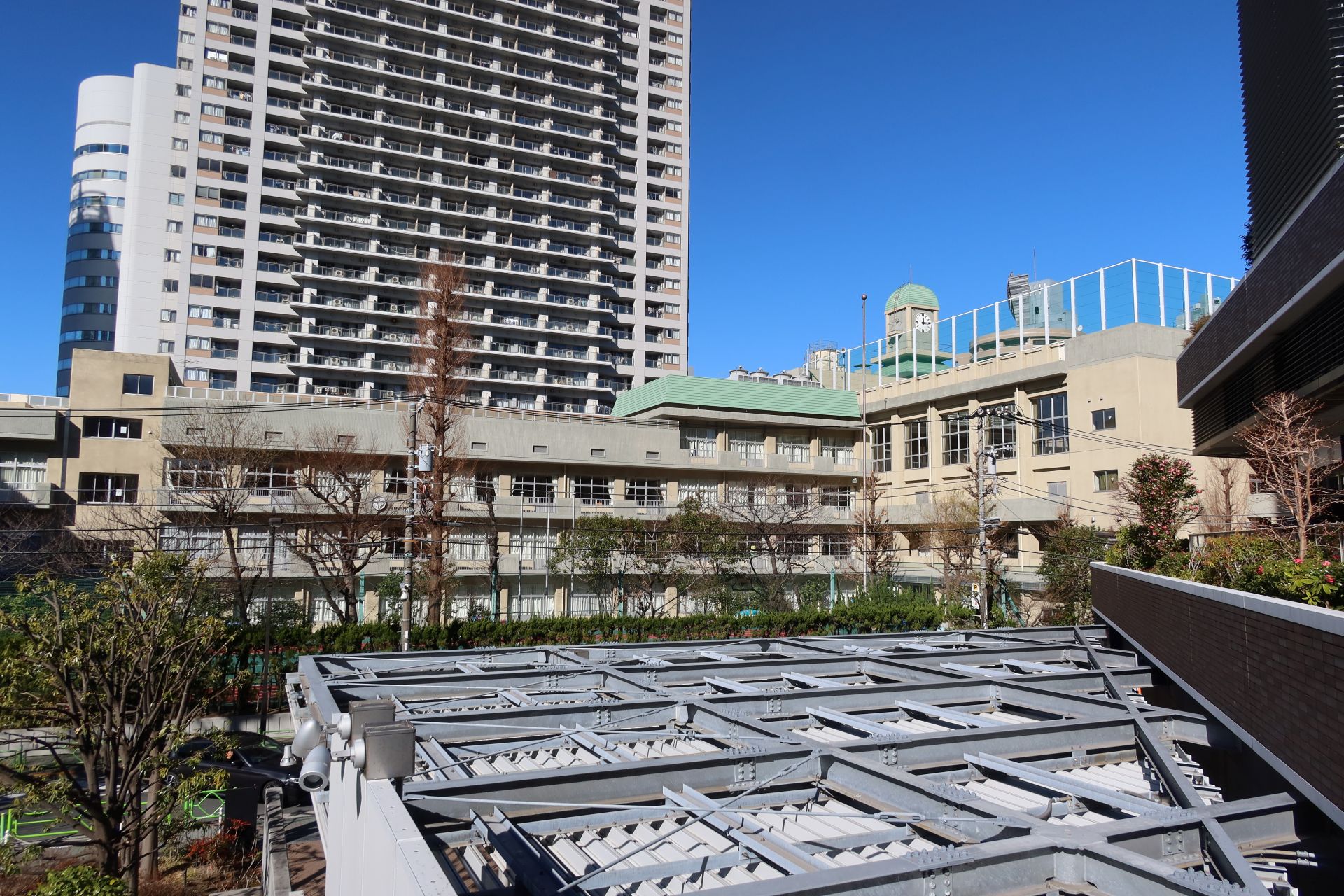 さらに歩いていくと月島第一小学校に到着、学校の前は片側3車線の清澄通りが走っており、交通量も多め。周囲にはいくつもタワーマンションが見え、学校の目の前でも新たに1棟が建設中のようでした。
