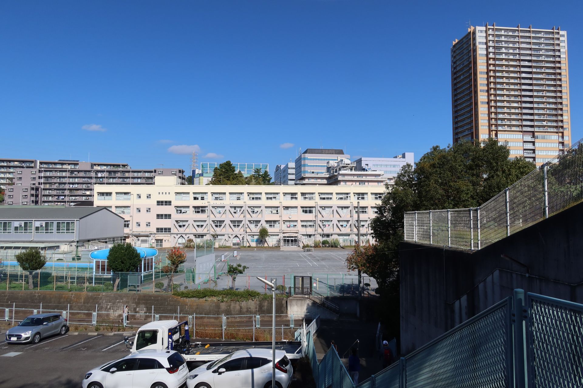 学校の周りはたくさんのマンションが建っており「いかにも東戸塚」という雰囲気のところです。その中で一番近い「クレール丘の街」という建物の外壁には防護ネットがかけられていましたが、おそらくリニューアル工事のためでしょう。東戸塚っていうと新しい町というイメージなのですが、このマンションの竣工は1987年のようなので、気が付けば40年近くの年月が経っているんですね。