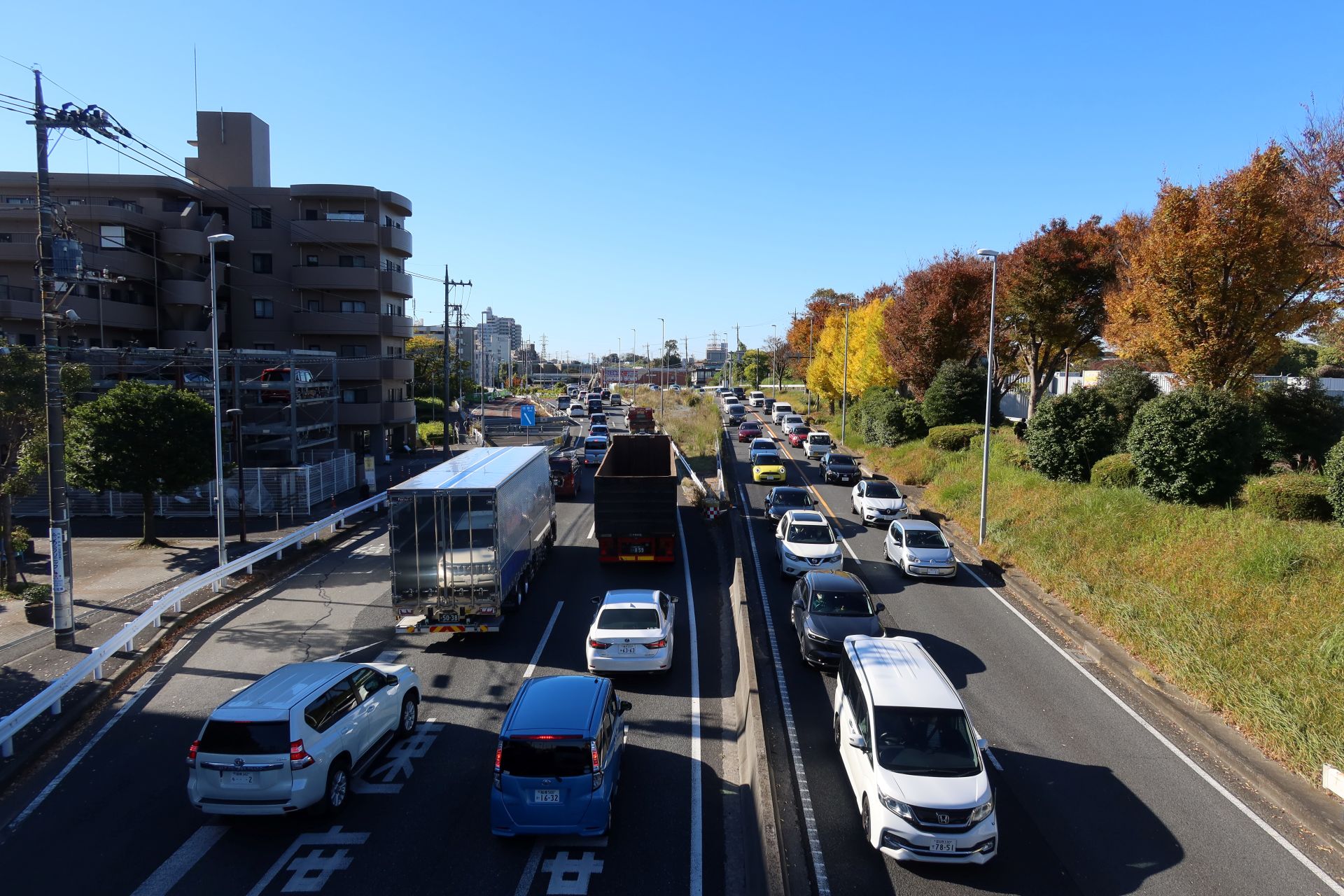 1・2枚目の写真は合流点そば(やや東京寄り)にある歩道橋上から撮影したものです。上りの戸塚警察署前、下りの影取、という渋滞名所(?)に挟まれたエリアにあるためか、両方向ともノロノロ運転になっていました。