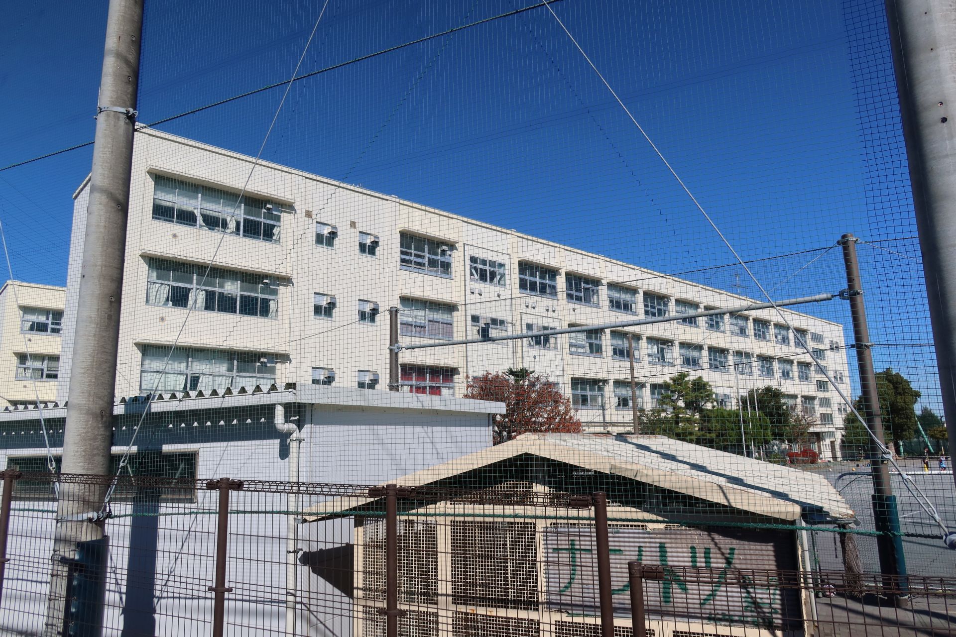 住宅地の中にある学校ですが、近くを横浜新道が通っているので車の音も聞こえます。学校の近くには高圧線の鉄塔があり、「東京南線3.4号線 91」の表記がありましたがどこから来てどこに向かうんだろう?